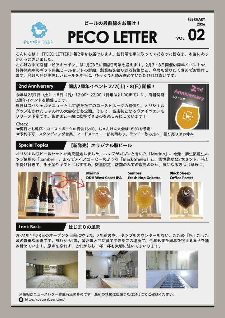 おかげさまで店舗「ビアキッチン」は1月28日に開店2周年を迎えます。2月7日(土)・8日(日)開催の周年イベントや、好評発売中のギフト用瓶ビールセットの詳細、創業時を振り返る特集など、今号も盛りだくさんでお届けします。